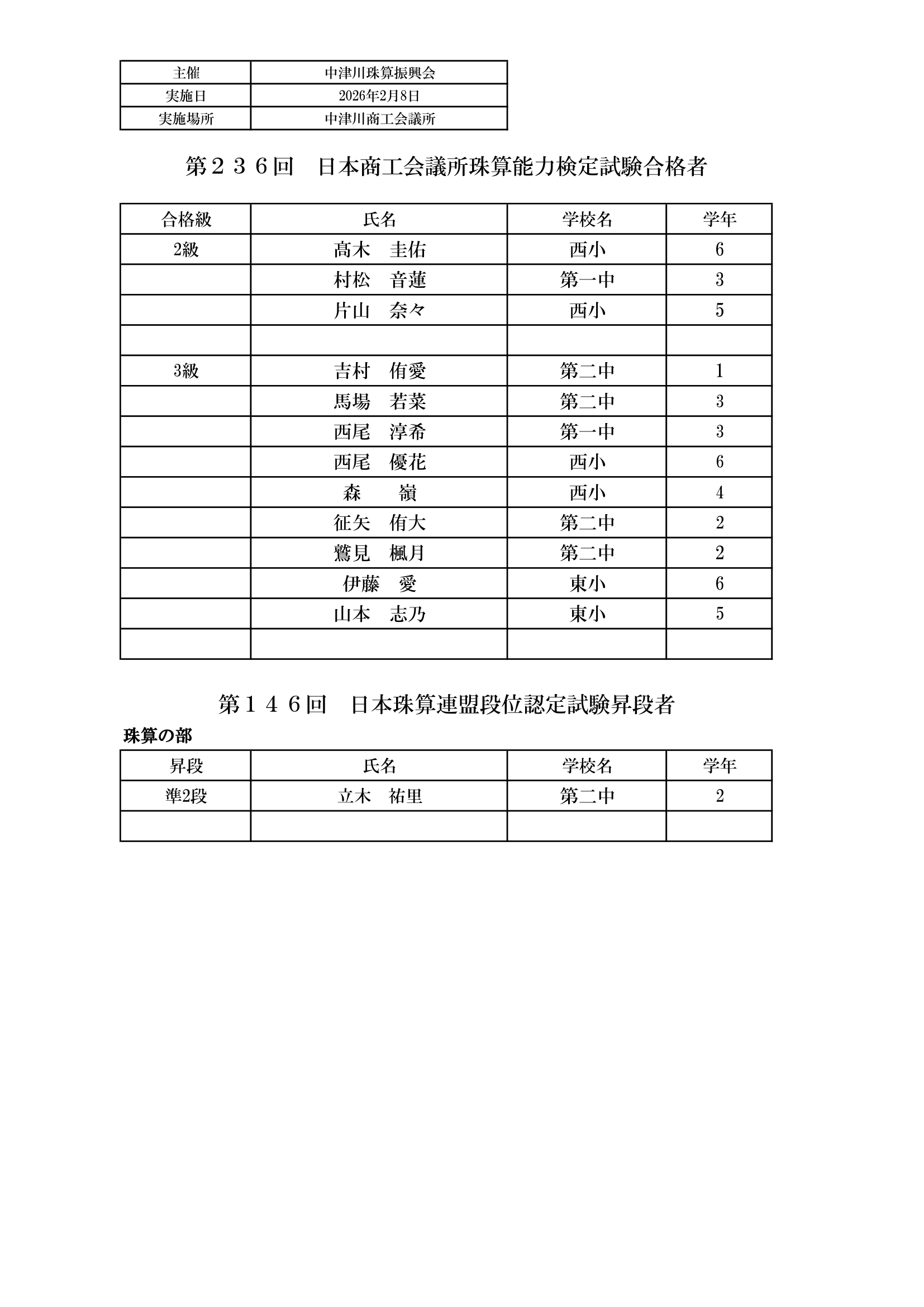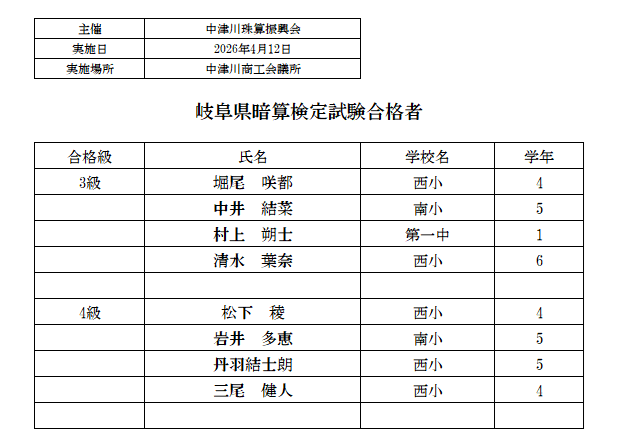 岐阜県珠算能力検定・岐阜県暗算検定試験合格者を掲載しました