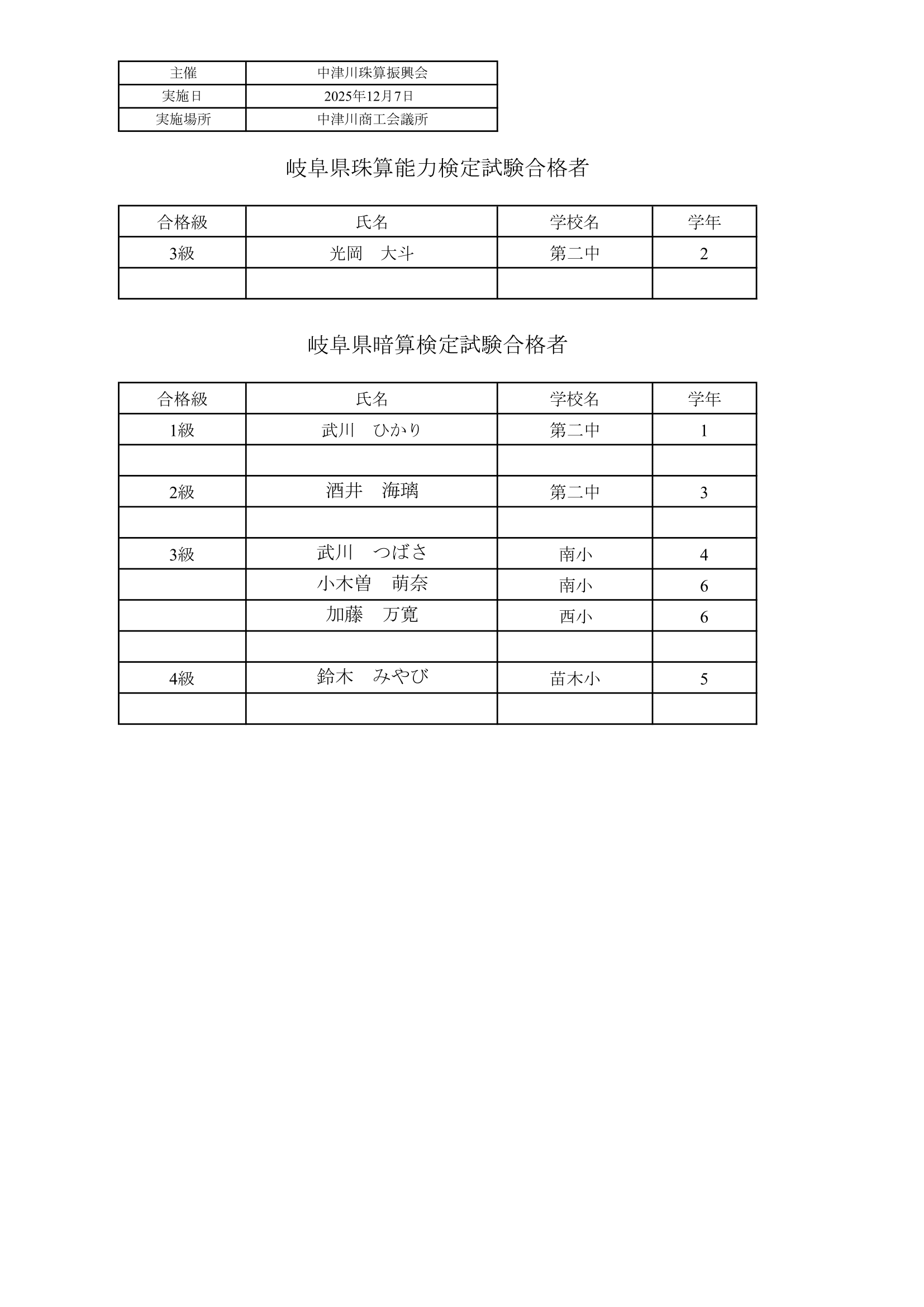 岐阜県珠算能力検定・岐阜県暗算検定試験合格者